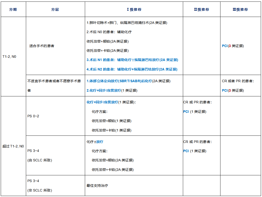 更新:对于T1-2 N0局限期SCLC,预防性脑照射(PCI)由原来的II级推荐(1类)更新为III级推荐(3类)。