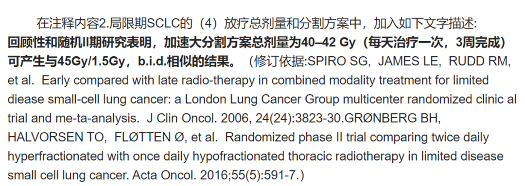 注释更新:在注释内容2加入第4条文字描述:“回顾性和随机II期研究表明,加速大分割方案总剂量为40-42Gy(每天治疗一次,3周完成)可产生与45Gy/1.5Gy,b.i.d相似的结果”。