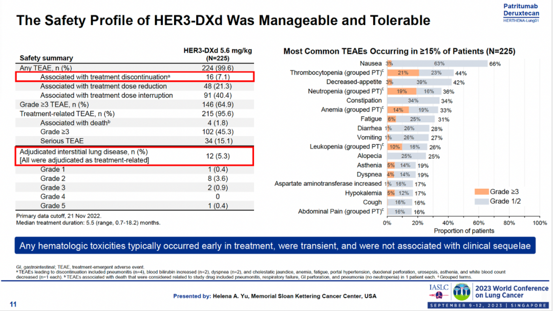 从药物的安全性上来看,45.3%的患者发生≥3级药物相关不良事件(TRAE),较U3-1402-A-U102研究中观察到≥3级TRAE发生率(56.9%)略有降低,可能与纳入人群的治疗线数有关。对于单药治疗来说,HER3-DXd整体的不良反应发生率还是比较高的,这也为后续的HER3-DXd与奥希替尼联合治疗方案(HERTHENA-Lung02)的安全性带来了较大的挑战。值得注意的是,12例患者(5.3%)发生药物相关性间质性肺疾病(1/2级9例;3级2例;5级1例),说明有受试者在治疗中因ILD不良反应发生了死亡事件。其间质性肺病的发生率与payload同为DXd的HER2 ADC药物DS8201(HER2-DXd)在DESTINY-Lung02研究中的发生率(5.9%)基本一致。