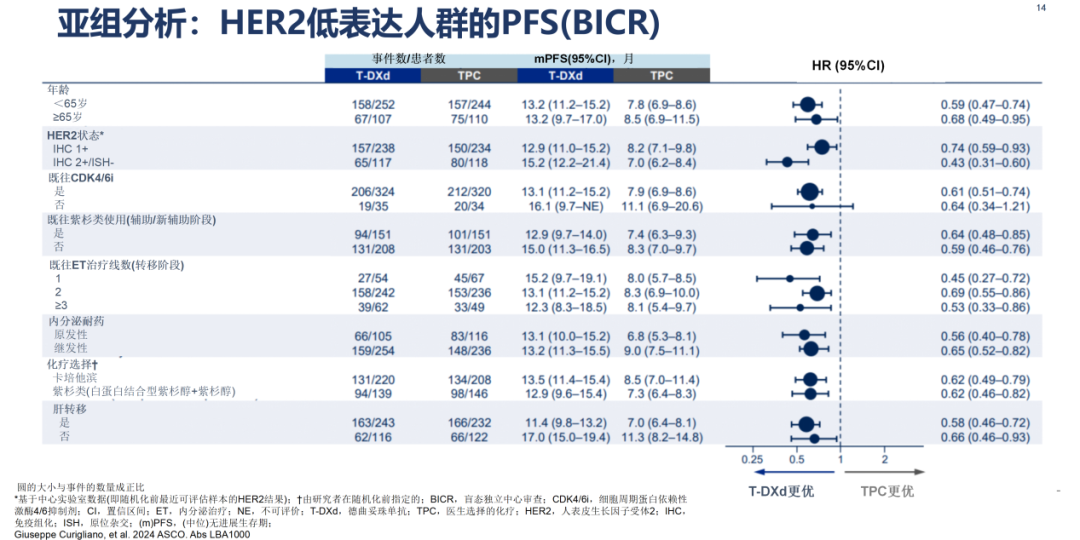 亚组分析显示,不同年龄组、不同HER2状态、既往接受过CDK4/6抑制剂治疗、无论是否接受过紫杉醇治疗、无论晚期阶段内分泌治疗线数、不同内分泌治疗耐药程度、接受何种TPC化疗方案、无论是否存在肝转移,患者均可从T-DXd治疗中得到PFS获益,但仍需积累更多事件数量。