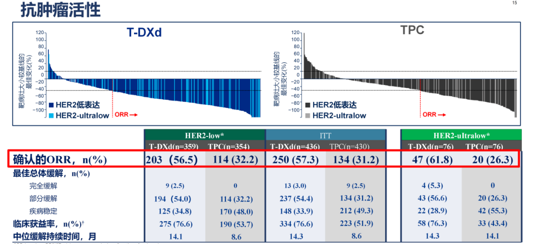 与TPC相比,T-DXd在HER2低表达、ITT、HER2-ultralow人群中均显示出良好的的抗肿瘤活性,确认的ORR分别达到56.5%、57.3%和61.8%。