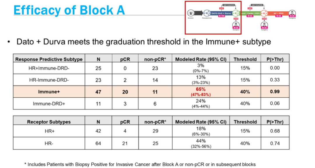 从本次大会公布的I-SPY2.2 Immune+亚组结果中,我们看到了Dato-DXd联合Durva仅仅用了4个疗程就使43%的患者在Block A阶段实现了pCR,根据模型测算的pCR率达65%,达到了毕业阈值,有望在该类群体中进一步开展Ⅲ期临床研究。可见只要药物足够好,足够强,完全可以在高风险的特定人群里做“减法”。